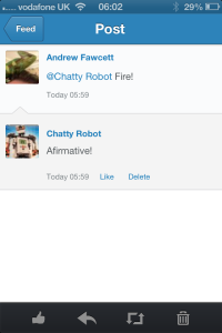 After a few late nights / mornings I finally got my second robot chatting with me via Salesforce Chatter! I chose to switch designs as it was easier to mount the Wifi sensor and move this robot around than the Alpha Rex. You cannot see it in the video but I was controlling it via the Chatter app on my iPhone, I took some screenshots after the video.