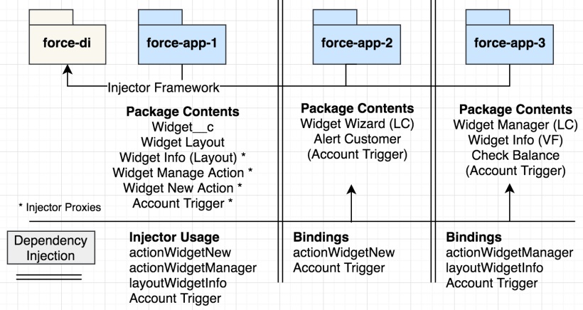 When developing within Salesforce, dependencies are formed in many ways, not just those made explicitly when writing code, but those formed by using declarative tools. Such as defining Actions and Layouts for example. This blog introduces a new open source library I have been working on called Force DI. The goal is to simplify and more importantly consolidate where and how to configure at runtime certain dependencies between Apex, Visualforce or Lightning component code.