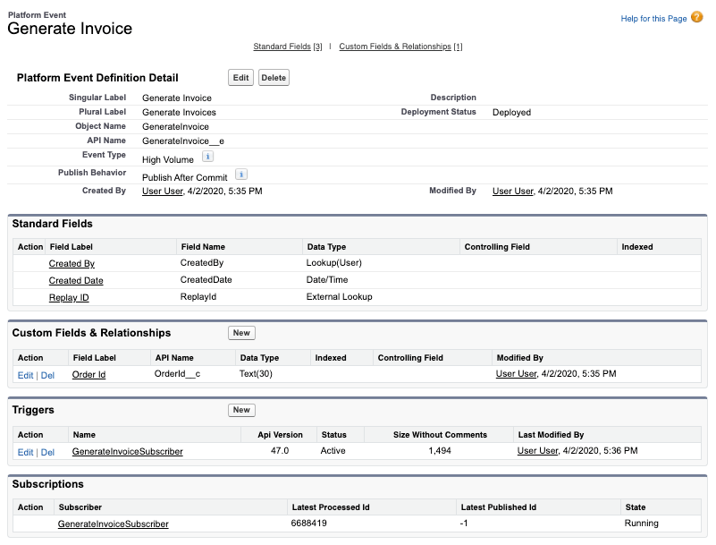Below is what the Generate Invoice Platform Event looks like, it simply has a reference to the Order Id (though it could equally reference an External Id on the Order object).