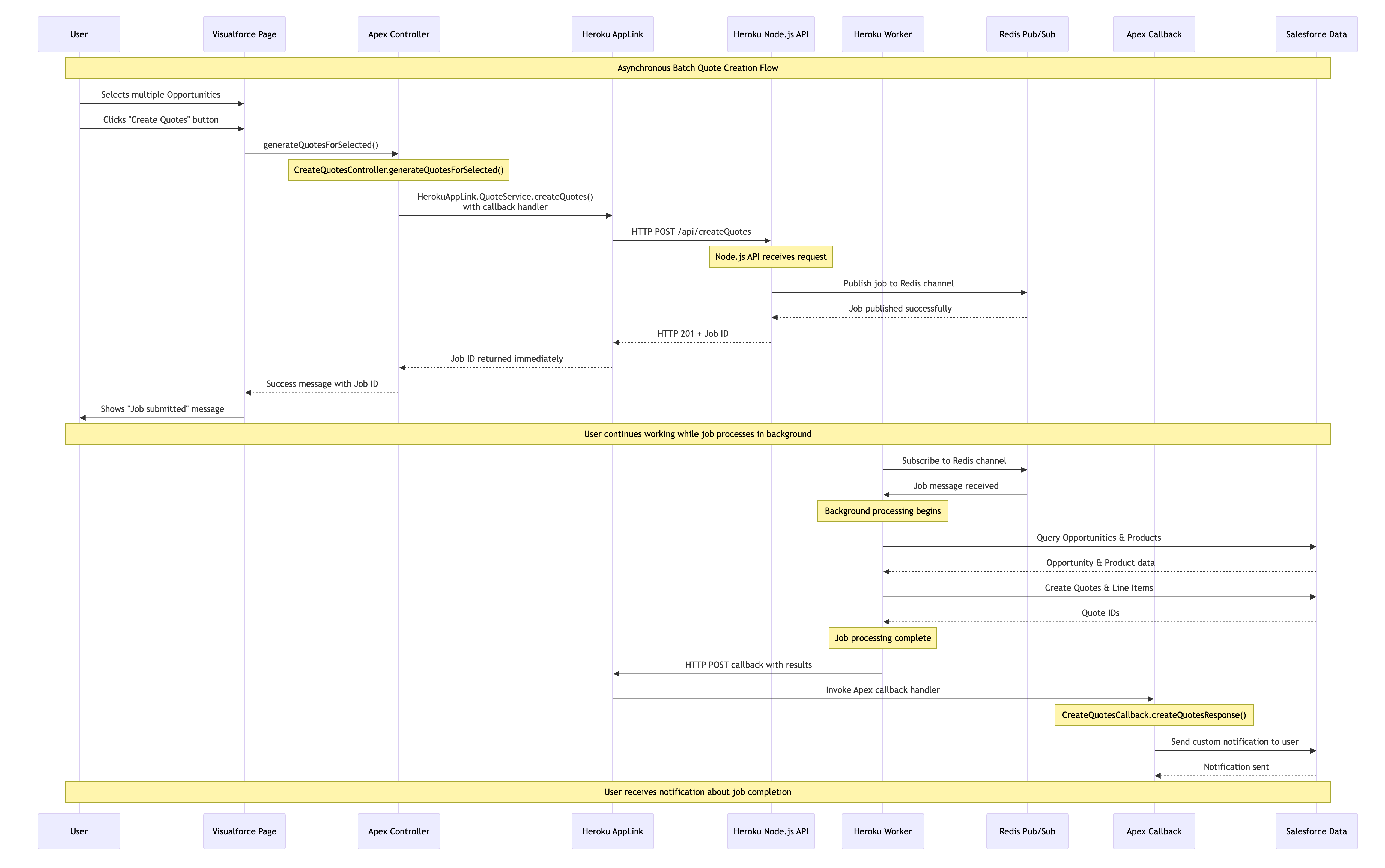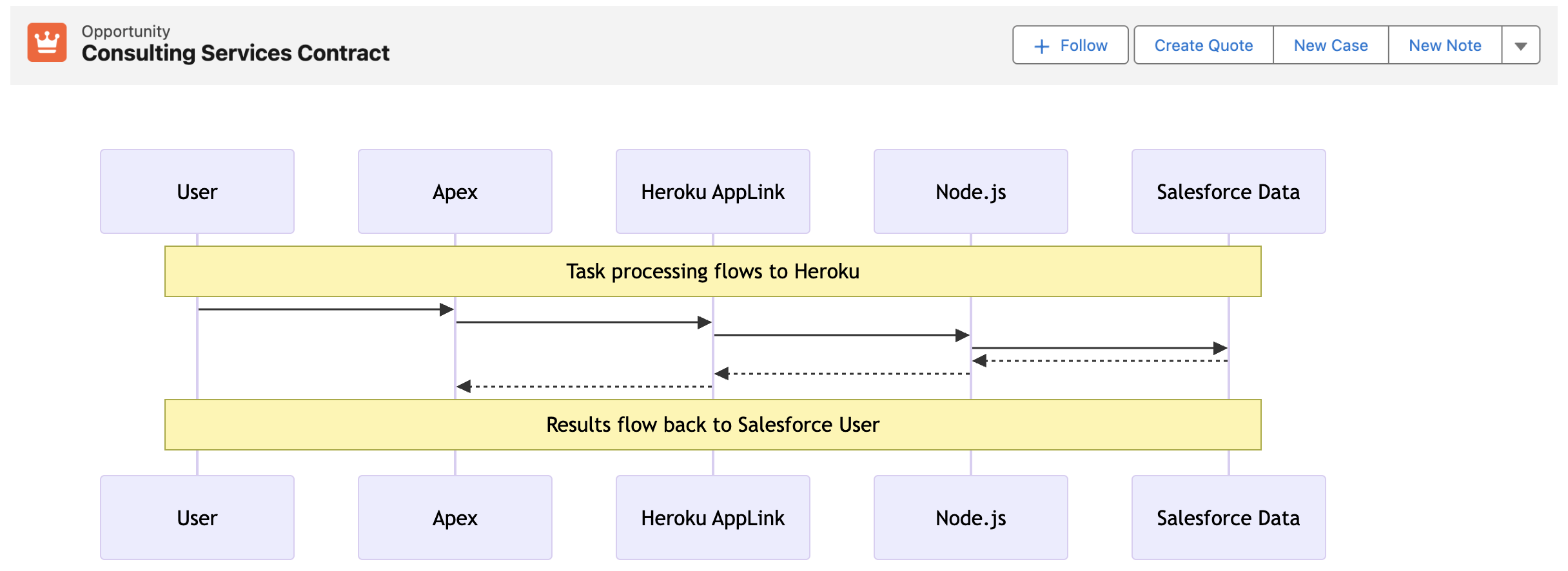 In this interactive (synchronous) example we are converting an Opportunity to a Quote – a task that can, depending on discount rules, size of the opportunity and additional regional tweaks, become quite compute heavy – sometimes in Apex hitting CPU or Heap limits. The sequence diagram below illustrates the flow of control from the User, through Apex, Heroku and back again. As always full code is supplied, but for now lets dig into the key code snippets below.
