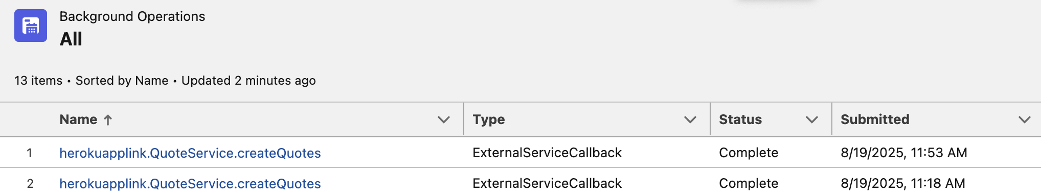 Additionally there are subsections in the README that cover the technical implementation of Heroku AppLink asynchronous callbacks. Configuration for Heroku App Async Callbacks provides the OpenAPI YAML structure required for callback definitions, including dynamic callback URLs and response schemas that Salesforce uses to generate the callback interface. Monitoring and Other Considerations explains AppLink’s External Services integration architecture, monitoring through the BackgroundOperation object, and the 24-hour callback validity constraint with Platform Event alternatives for extended processing times or in progress updates.