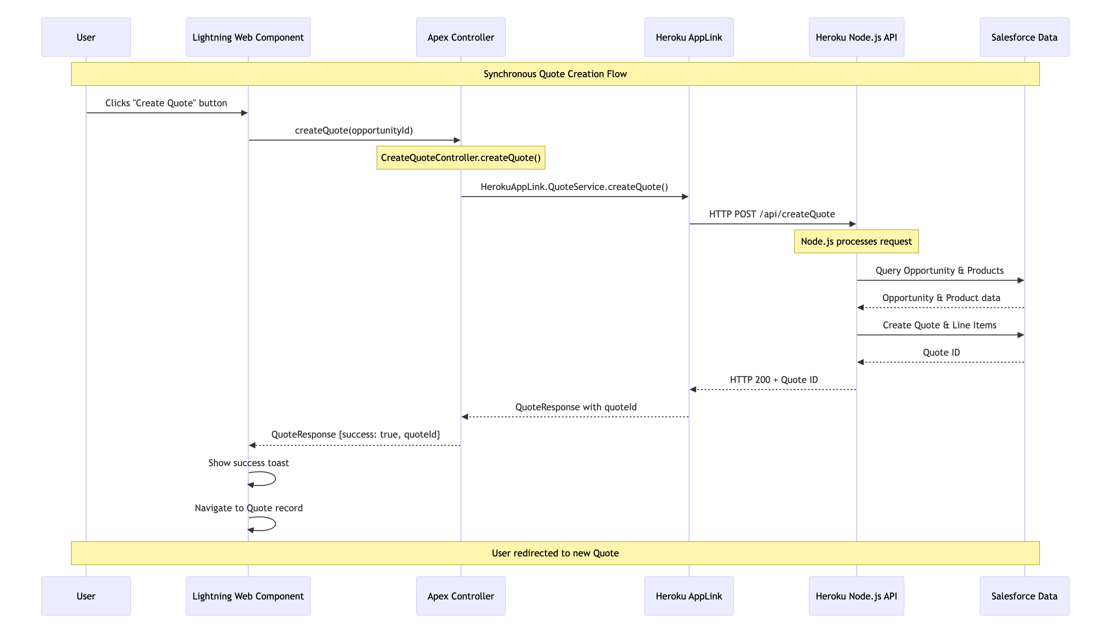 We start out with an Apex Controller that is attached to the “Create Quote” LWC button on the Opportunity page. This Apex Controller calls the Heroku AppLink exposed conversion logic (in this case written in Node.js – more on this later) – and waits for a response before returning control back to Lighting Experience to redirect the user to the newly created Quote. As you can see the HerokuAppLink namespace contains dynamically generated types for the service.