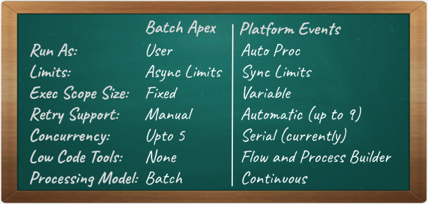Batch Apex also provides a means to orchestration sequentially the processing of records in chunks, so I thought I would end here with a summary of some of the other differences. As you can see one of the key ones to consider is the user identity the code runs as. This is not impossible to workaround in the platform event handler case, but requires some coding to explicitly set the OwnerId field on records if that information is important to you. Overall though I do feel that Platform Events offers some useful options for switching to a more continuous mode of operation vs batch, so long as your aware of the differences this might be a good fit for you.