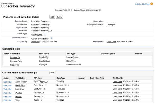 I used Platform Events to publish telemetry about the execution of the above handlers, by creating another Platform Event called Subscriber Telemetry and used a Lightning Web Component to monitor the events in realtime. Because Platform Events can be declared as being outside the standard Apex Transaction they are sent immediately using the “Publish Immediately” setting, they are sent even if an error occurs.